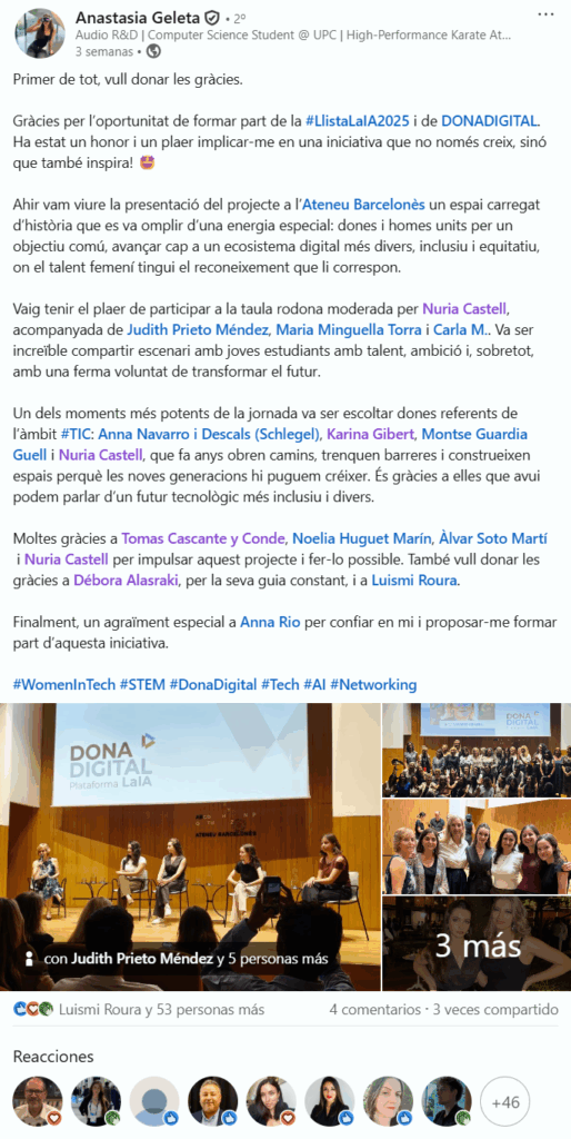 Anastasia Geleta a la taula rodona de la Llista LaIA 2025 (LinkedIn)Per alex / octubre 6, 2025 Font: Anastasia Geleta (LinkedIn), 10/09/2025