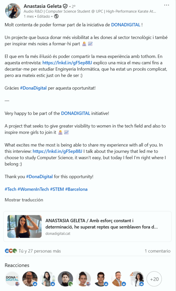 Anastasia Geleta comparteix la seva experiència com a Estudiant Referent TIC dins la iniciativa DONADIGITAL (LinkedIn)Per alex / octubre 9, 2025 Font: Anastasia Geleta (LinkedIn), 05/09/2025