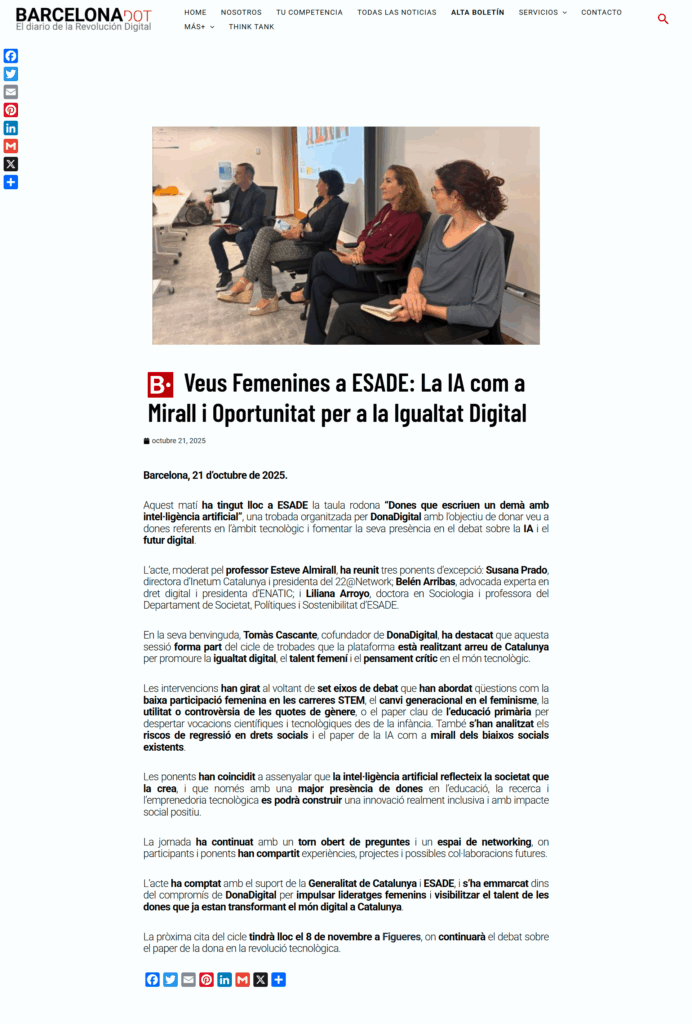 Aquest matí ha tingut lloc a ESADE la taula rodona “Dones que escriuen un demà amb intel·ligència artificial”, una trobada organitzada per DonaDigital amb l’objectiu de donar veu a dones referents en l’àmbit tecnològic i fomentar la seva presència en el debat sobre la IA i el futur digital.
