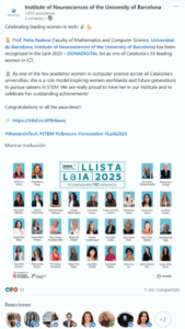 L’Institut de Neurociències de la UB celebra el reconeixement de Petia Radeva com a Dona Referent TIC a la Llista LaIA 2025 (LinkedIn)