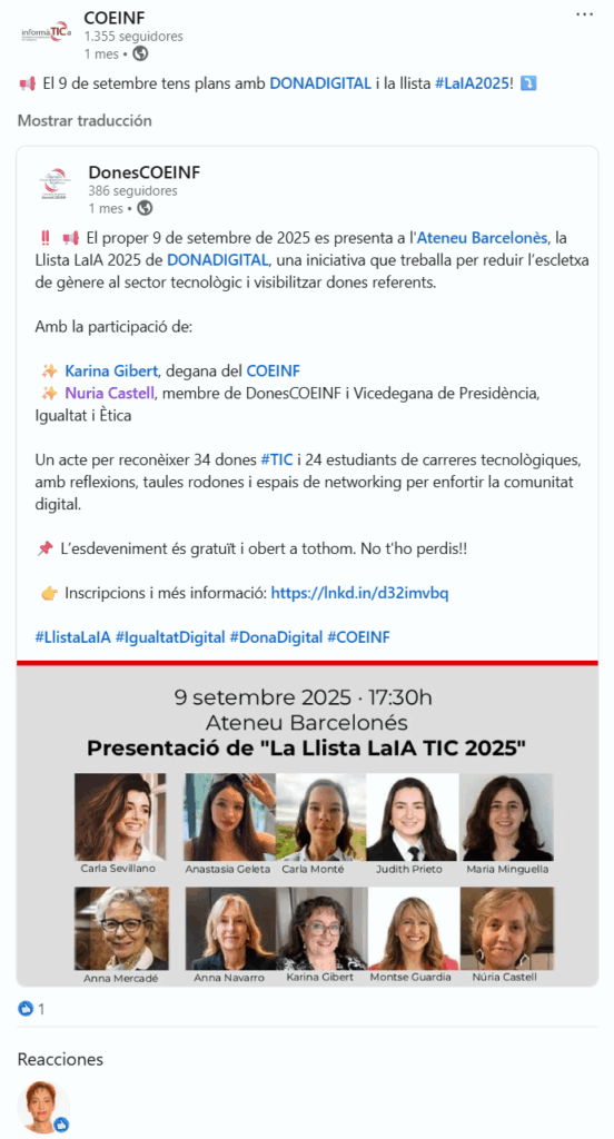 COEINF destaca la presentació de la Llista LaIA 2025 com a espai per visibilitzar dones referents TIC (LinkedIn)Per alex / octubre 9, 2025 Font: COEINF (LinkedIn), 05/09/2025