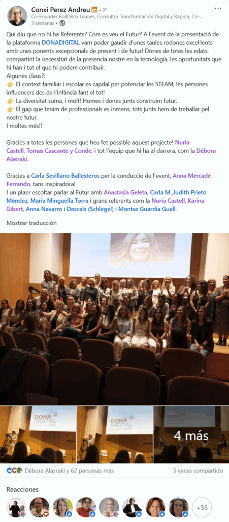Conxi Pérez Andreu comparteix les claus del futur del talent femení TIC en l’acte de DONADIGITAL (LinkedIn)Per alex / octubre 6, 2025 Font: Conxi Pérez Andreu (LinkedIn), 09/09/2025