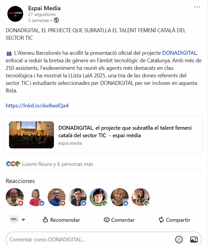 DONADIGITAL, el projecte que subratlla el talent femení català del sector TIC (Espai Media – LinkedIn)Per alex / octubre 6, 2025 Font: Espai Media (LinkedIn), 09/09/2025
