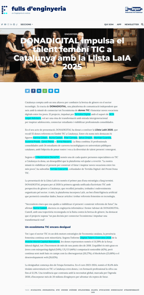 DONADIGITAL impulsa el talent femení TIC a Catalunya amb la Llista LaIA 2025 (Fulls d’Enginyeria)Per alex / octubre 13, 2025 Font: Fulls d’Enginyeria, 01/09/2025