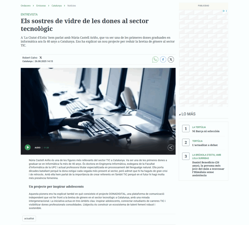 Entrevista a Núria Castell (Onda Cero)Per alex / octubre 6, 2025 Font: Onda Cero Catalunya, 26/08/2025