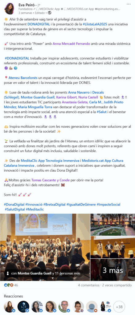 Eva Peiró destaca el talent femení present a la Llista LaIA 2025 en l’acte de DONADIGITAL (LinkedIn)Per alex / octubre 6, 2025 Font: Eva Peiró (LinkedIn), 09/09/2025