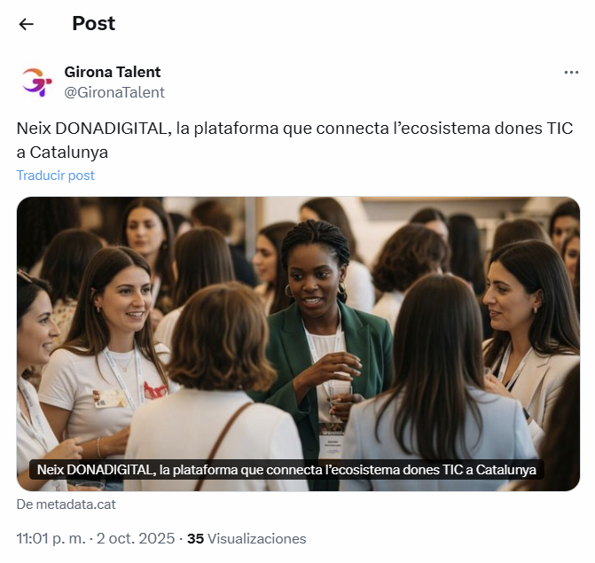 Girona Talent celebra el naixement de DONADIGITAL, la plataforma que impulsa la connexió de dones TIC a Catalunya (X)Per alex / octubre 9, 2025 Font: Girona Talent (X), 02/10/2025