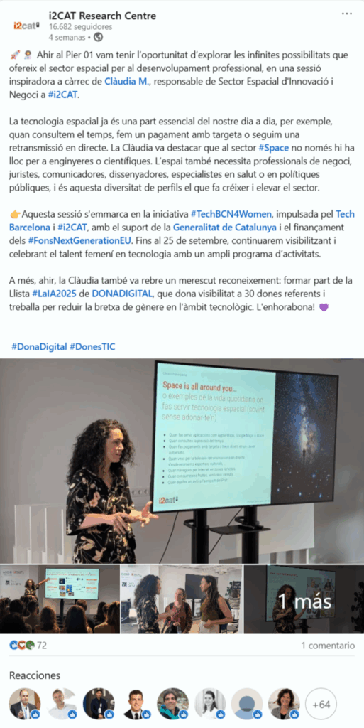i2CAT celebra el reconeixement de Clàudia Mateu com a Dona Referent TIC de la Llista LaIA 2025 (LinkedIn)Per alex / octubre 9, 2025 Font: i2CAT Research Centre (LinkedIn), 10/09/2025