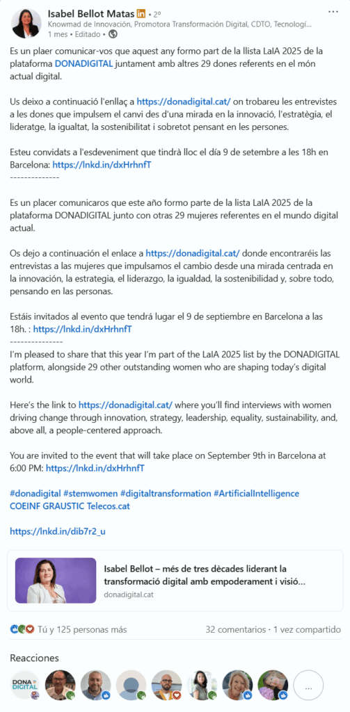 Isabel Bellot Matas s’incorpora a la Llista LaIA 2025 com a Dona Referent del Món Digital (LinkedIn)Per alex / octubre 9, 2025 Font: Isabel Bellot Matas (LinkedIn), 04/09/2025