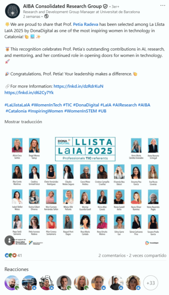Petia Radeva reconeguda a la Llista LaIA 2025 (AIBA Consolidated Research Group – LinkedIn)Per alex / octubre 6, 2025 Font: AIBA Consolidated Research Group (LinkedIn), 13/09/2025