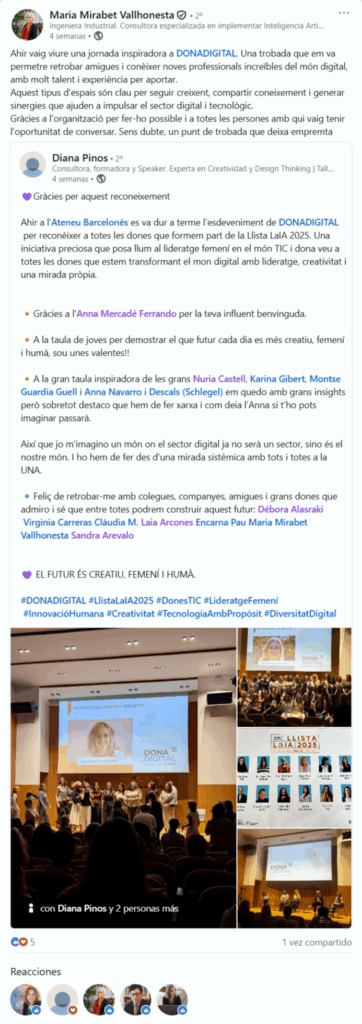 Maria Mirabet Vallhonesta comparteix la seva experiència a l’esdeveniment DONADIGITAL i la Llista LaIA 2025 (LinkedIn)Per alex / octubre 9, 2025 Font: Maria Mirabet Vallhonesta (LinkedIn), 10/09/2025