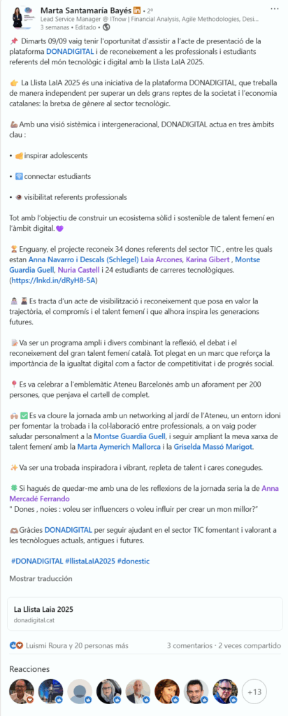 Marta Santamaría Bayés assisteix a la presentació de DONADIGITAL i la Llista LaIA 2025 (LinkedIn)Per alex / octubre 6, 2025 Font: Marta Santamaría Bayés (LinkedIn), 09/09/2025