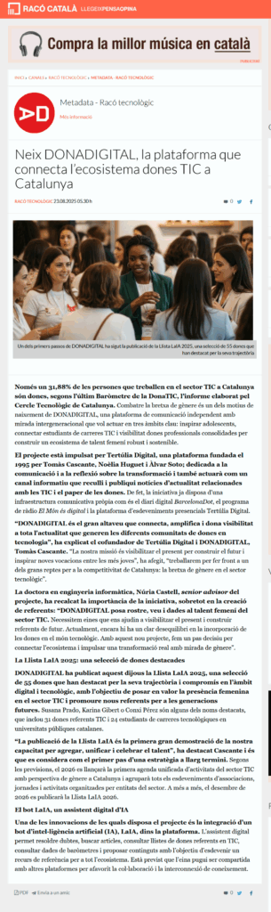 Neix DONADIGITAL, la plataforma que connecta l’ecosistema de dones TIC a Catalunya (Racó Català)Per alex / octubre 13, 2025 Font: Racó Català, 23/08/2025