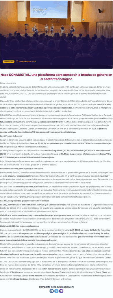 Neix DONADIGITAL, una plataforma per combatre la bretxa de gènere en el sector tecnològic (DonesDigital.cat)Per alex / octubre 6, 2025 Font: DonesDigital.cat, 29/09/2025
