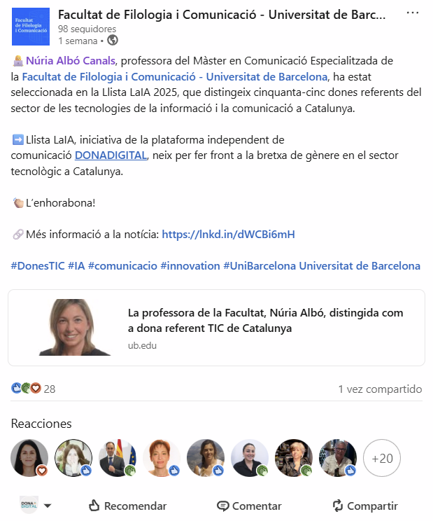 Núria Albó seleccionada a la Llista LaIA 2025 (Facultat de Filologia i Comunicació – LinkedIn)Per alex / octubre 2, 2025 Font: Facultat de Filologia i Comunicació – Universitat de Barcelona (LinkedIn), 24/09/2025