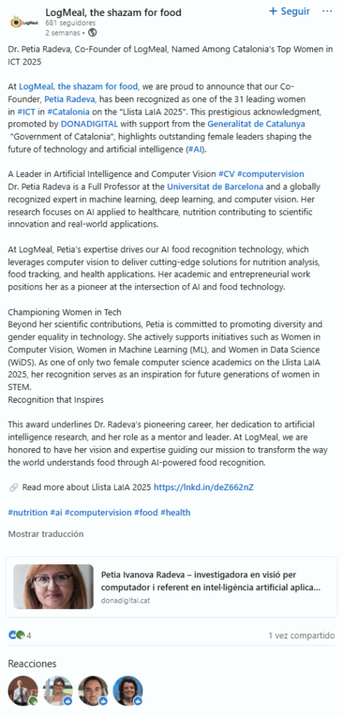 Petia Radeva reconeguda entre les Top Women in ICT 2025 (LogMeal – LinkedIn)Per alex / octubre 2, 2025 Font: LogMeal (LinkedIn), 18/09/2025