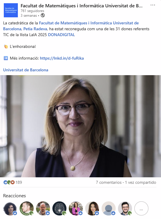 Reconeixement de Petia Radeva a la Llista LaIA 2025 (Facultat de Matemàtiques i Informàtica – Universitat de Barcelona, LinkedIn)Per alex / octubre 6, 2025 Font: Facultat de Matemàtiques i Informàtica – Universitat de Barcelona (LinkedIn), 13/09/2025