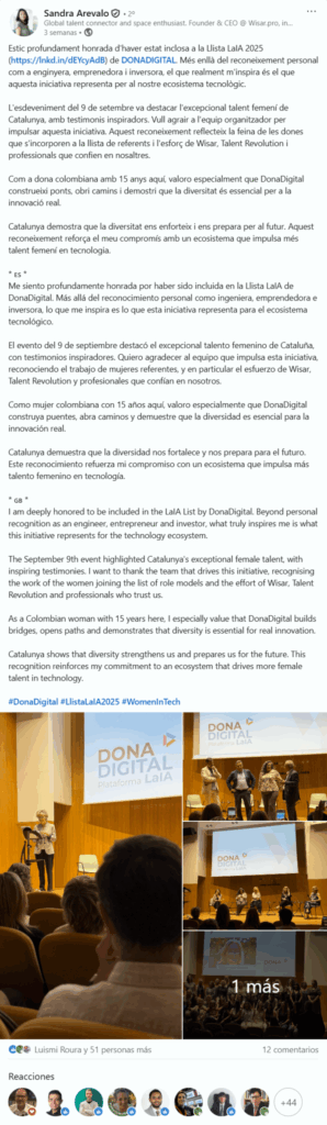 Sandra Arévalo, reconeguda a la Llista LaIA 2025 per DONADIGITAL (LinkedIn)Per alex / octubre 6, 2025 Font: Sandra Arévalo (LinkedIn), 09/09/2025